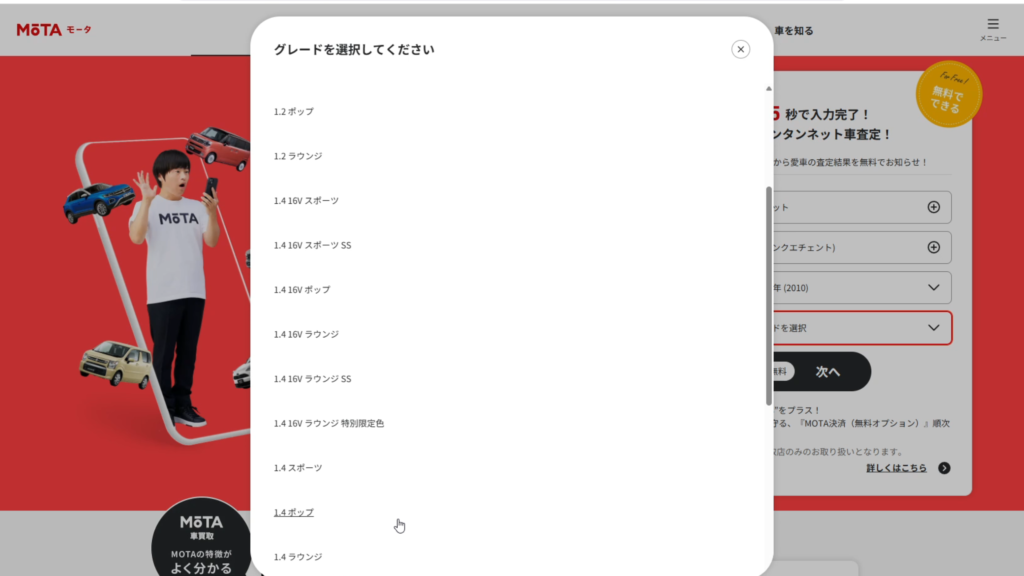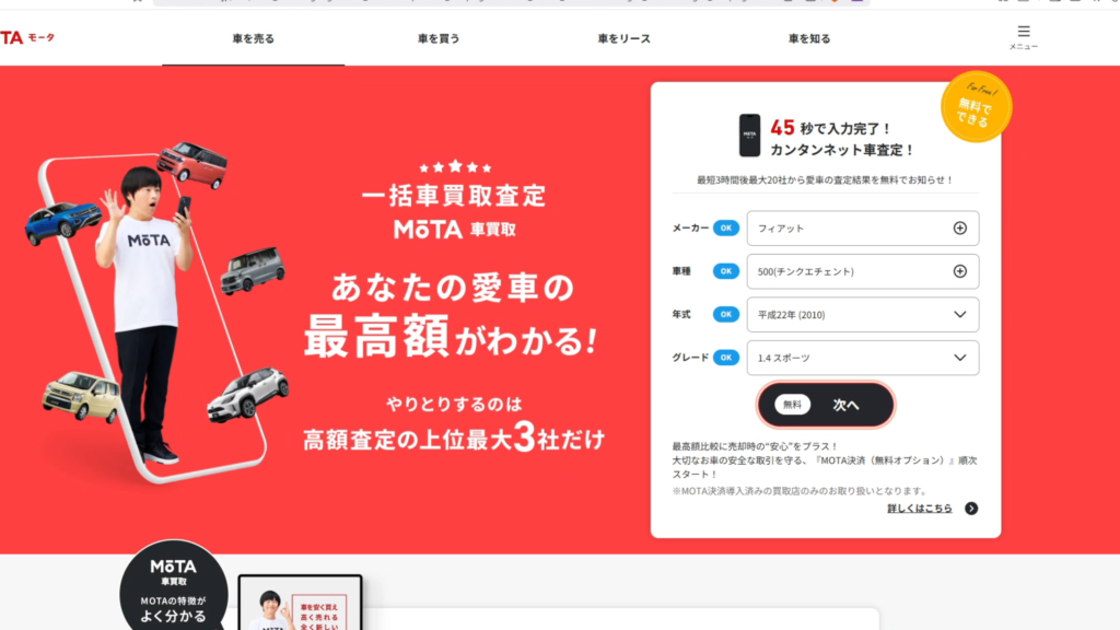 私が今回使った一括査定サイトはMOTA。MOTAでは、車の情報を入力して、写真を撮るだけで、ある程度の買取金額を提示してくれる。しかも、提示してくる会社は最大20社。
