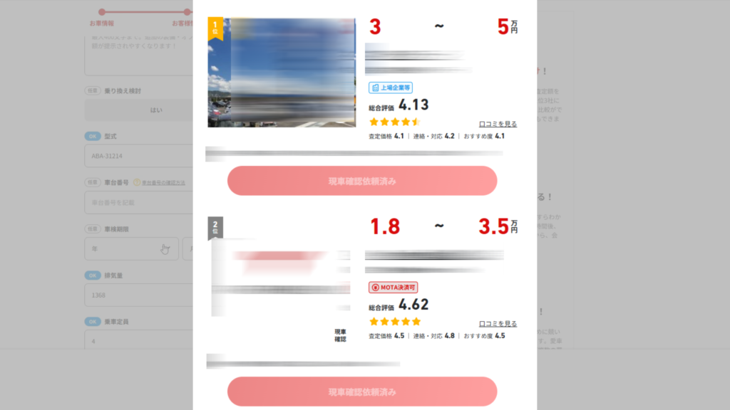 また、一括査定に電話番号を登録すると、電話が鳴りやまないという大デメリットがある。しかし、MOTAでは、買取金額の高い3社のみから電話がかかってくる。そのため、無駄な電話対応をする必要はない。また、買取金額が4位以降の車屋さんでも、自分が希望すれば電話をかけて現車確認してもらうことが可能となっている。